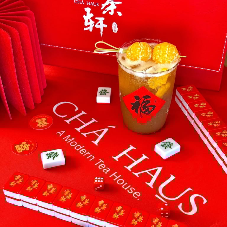 "The Lucky Mandarin" — Sip into prosperity. We've infused whole, juicy Shatangju (a super-sweet mandarin) into our tea, creating a burst of sunshine in every cup. Refreshing and uplifting. Mini Game: Each cup comes with a lucky tile. Collect 4 of a kind to claim your big “Hu!” discount!